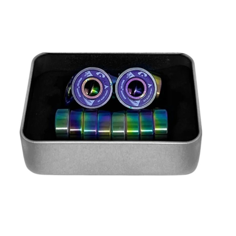 Estos cojinetes cuentan con un recubrimiento de titanio que les ayuda a resistir el desgaste durante más tiempo, al tiempo que proporciona una menor fricción y, por lo tanto, un cojinete más rápido. Están hechos para el estándar de la industria 608 diámetro interior del cojinete en las ruedas. Nuestros rodamientos cuentan con un protector de goma extraíble que permite un fácil mantenimiento, reduce en gran medida la fricción, y no tiene ninguno de los molestos ruidos de traqueteo de los protectores de metal regulares.